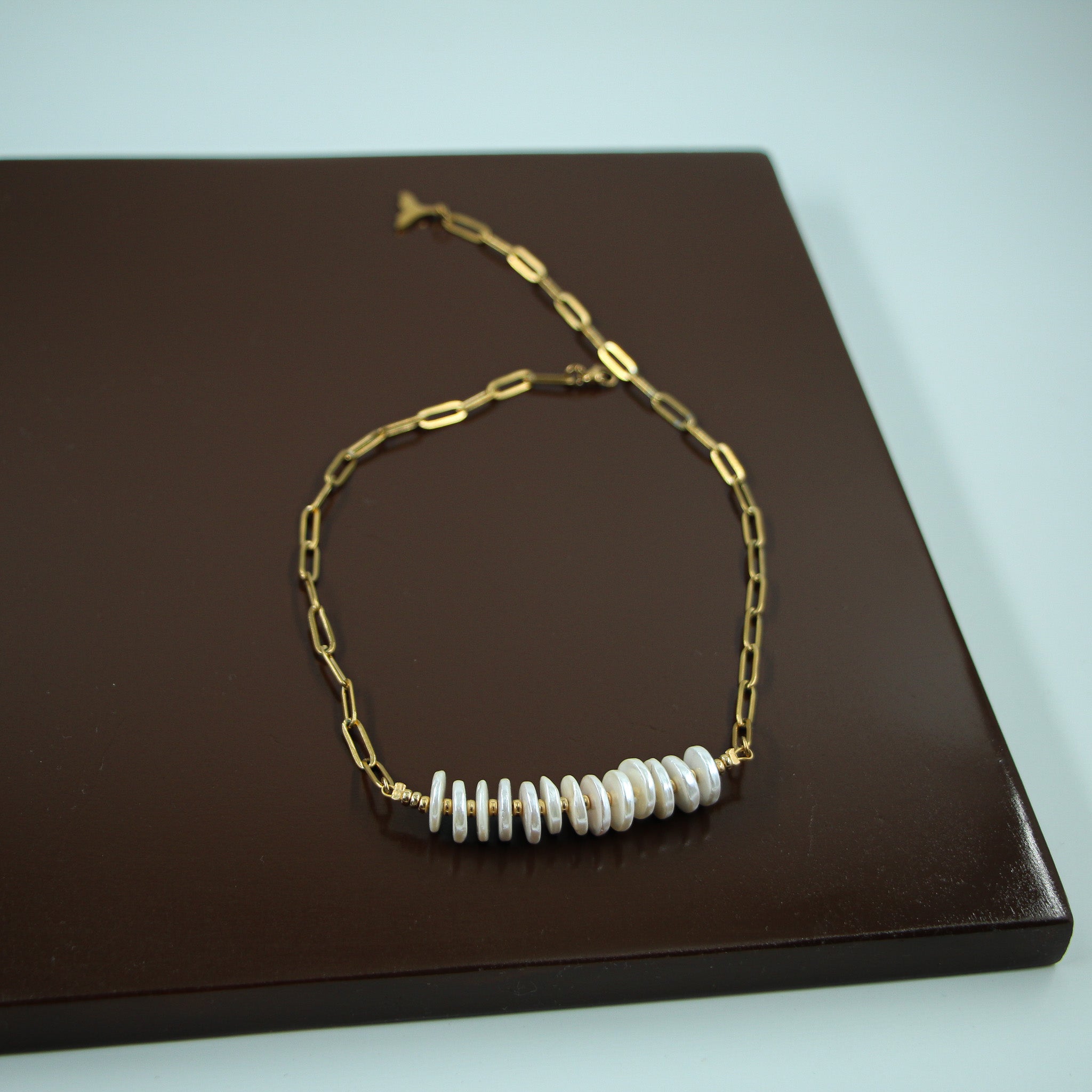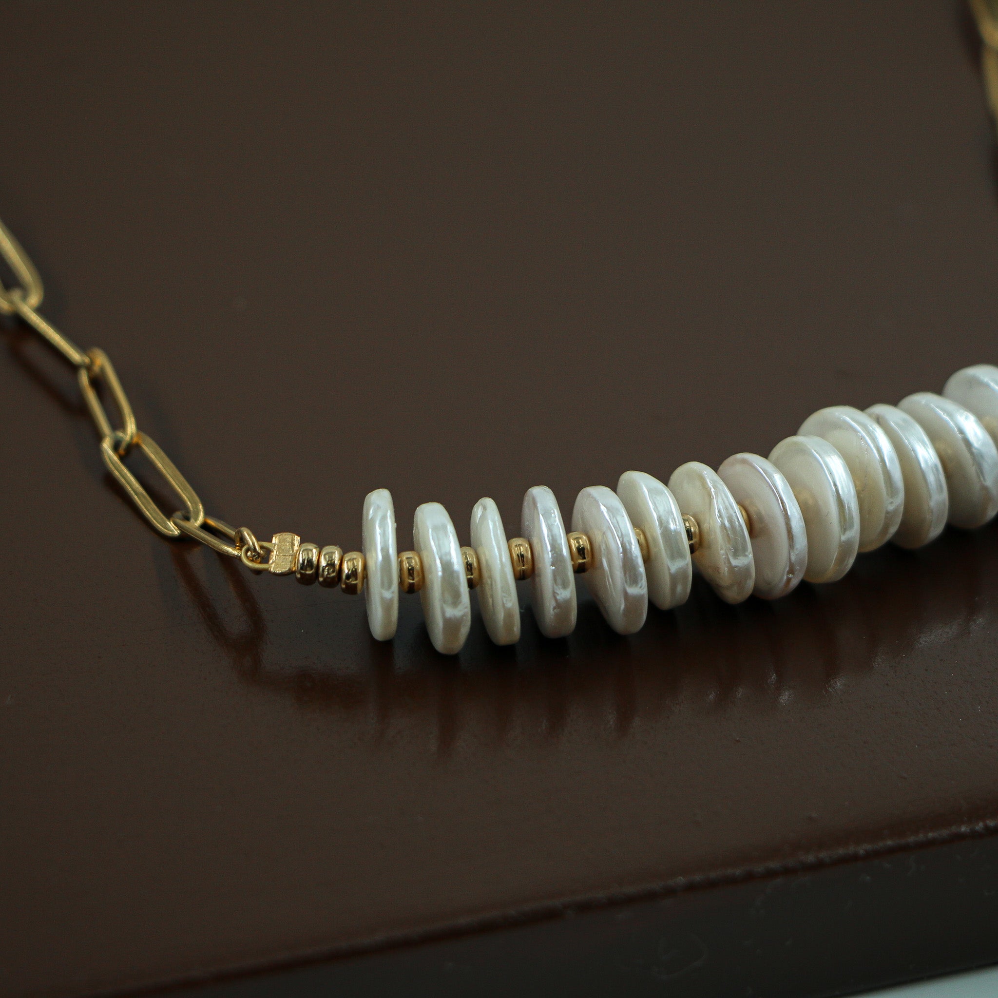 • Κολιέ μαργαριτάρι ροδέλα συνδυασμένο με ατσάλινη αλυσίδα επιχρυσωμένη