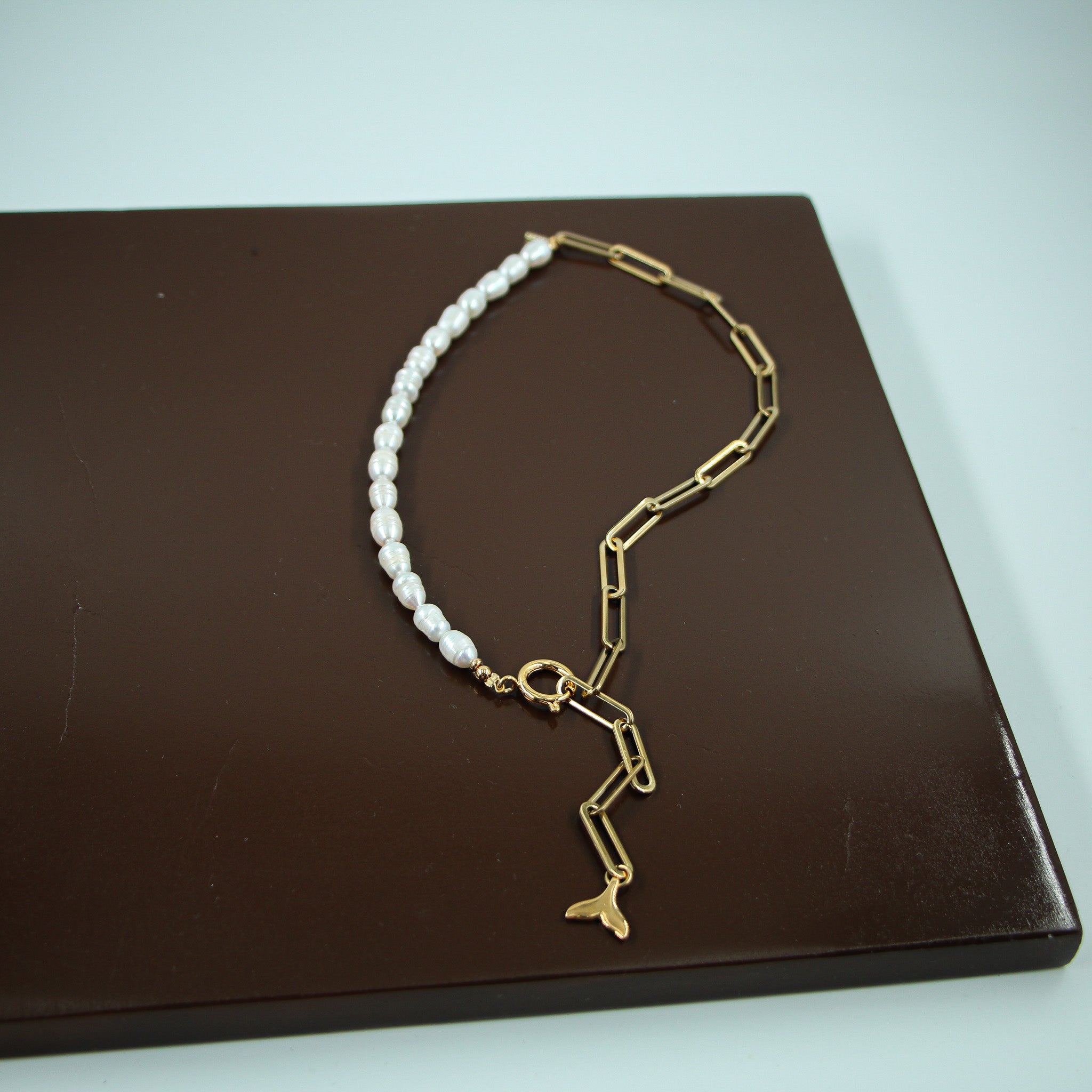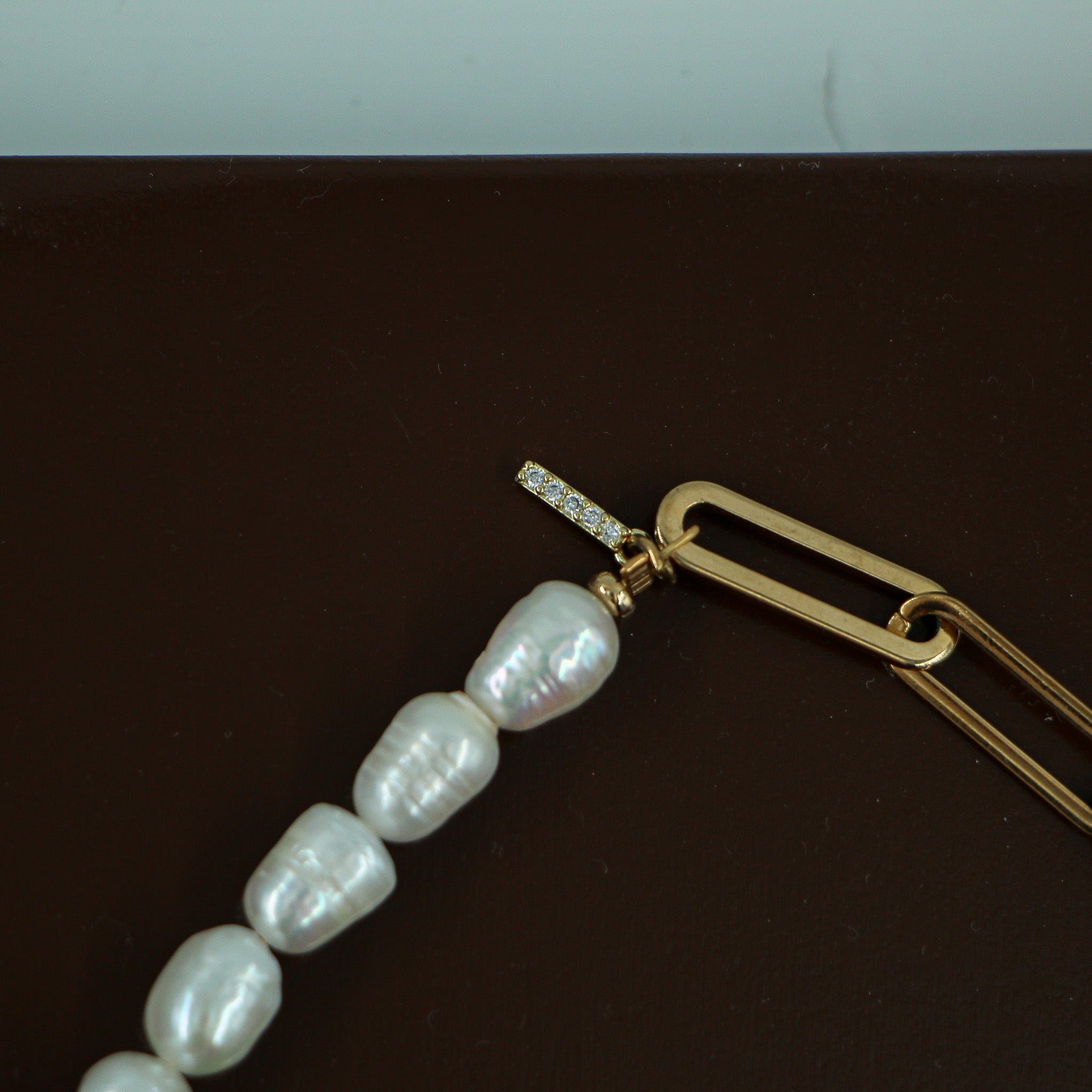 - Κολιέ με μαργαριτάρι του γλυκού νερού 9mm συνδυασμένο με ατσάλινη επιχρυσωμένη αλυσίδα