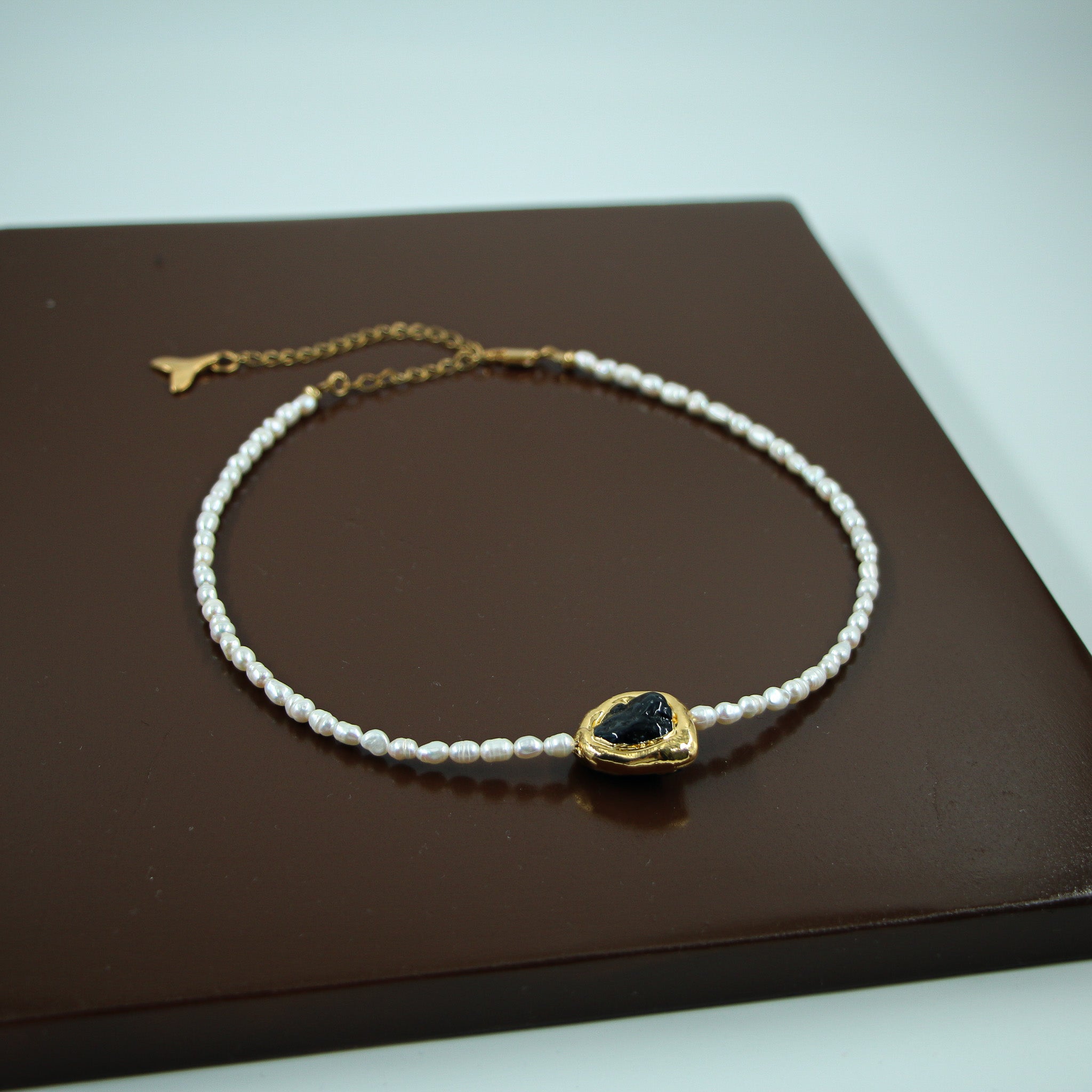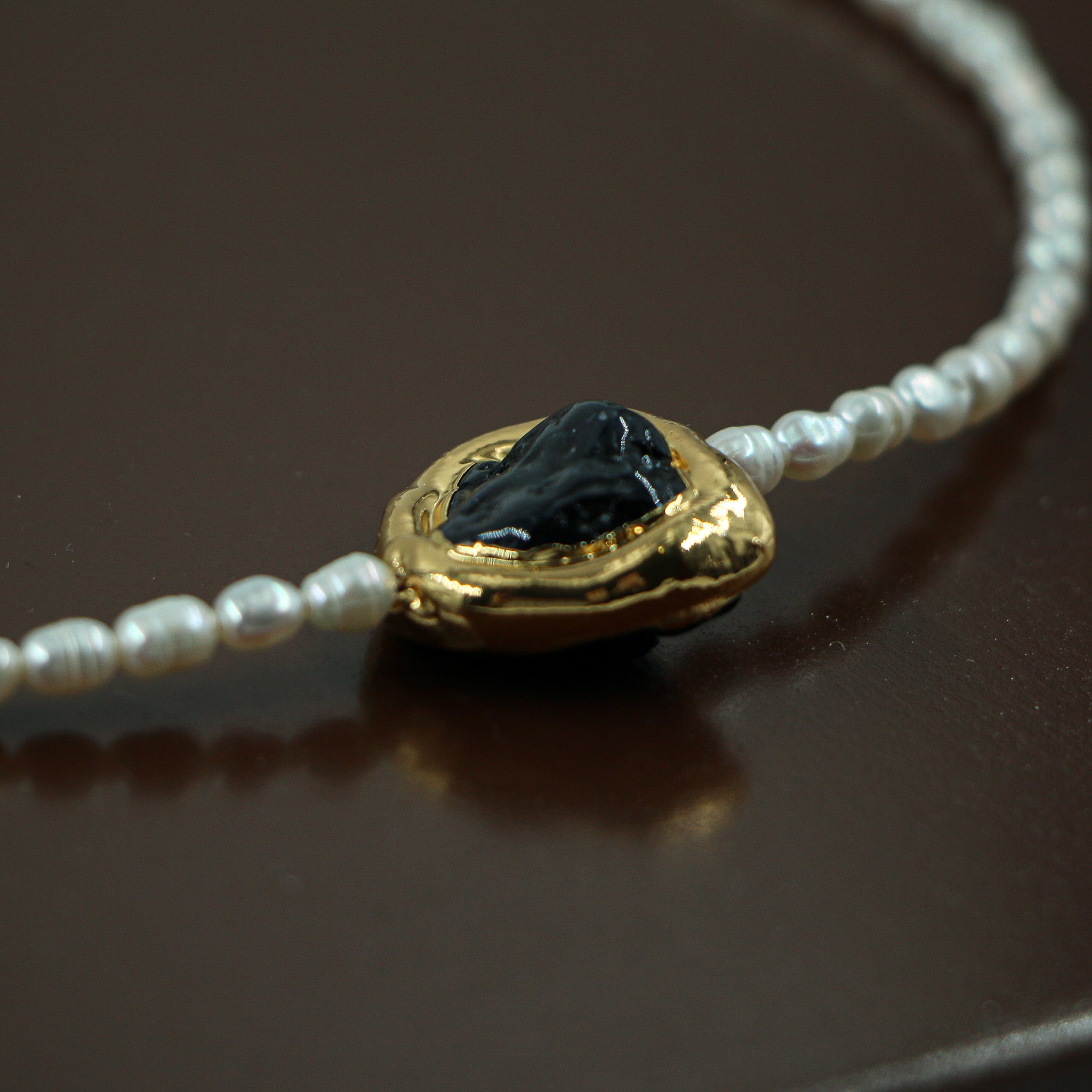 - Κολιέ με μαργαριτάρι του γλυκού νερού ρυζάκι με περαστή ημιπολύτιμη πέτρα 20-25mm με χρυσό περίγραμμα